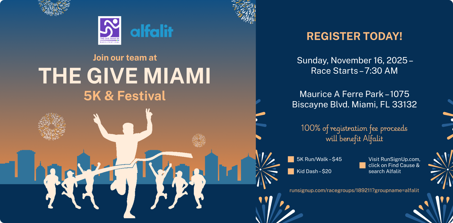 Join Alfalit on Sunday, November 16, at Maurice A. Ferre Park for the inaugural Give Miami 5K and Festival—a fresh way for those who care about Miami to participate in our community’s largest generosity campaign.